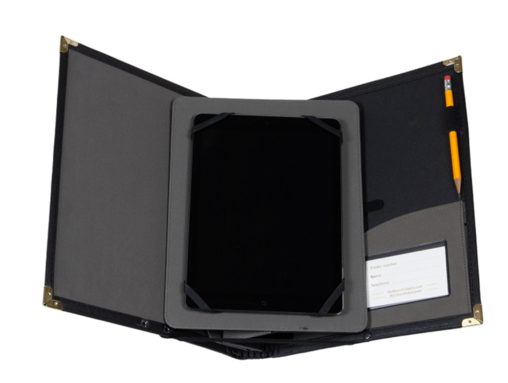 Something like this one. Or see image below. (And if you’re using an iPad, please get a folder that looks like a sheet music folder like the mypad [see image below].)
